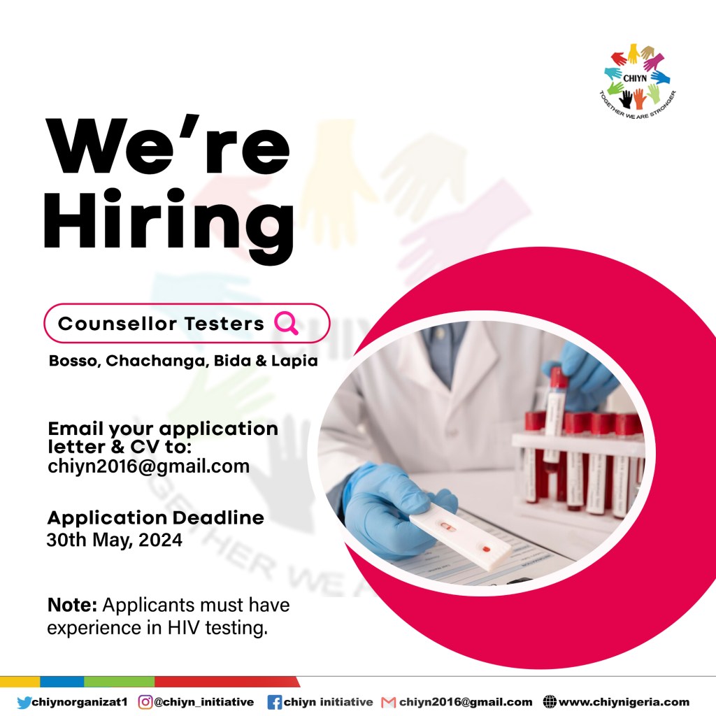 We urgently need individuals with experience in HIV testing and services to apply. Applicants must be residents of Bosso, Chachanga, Bida & Lapia.