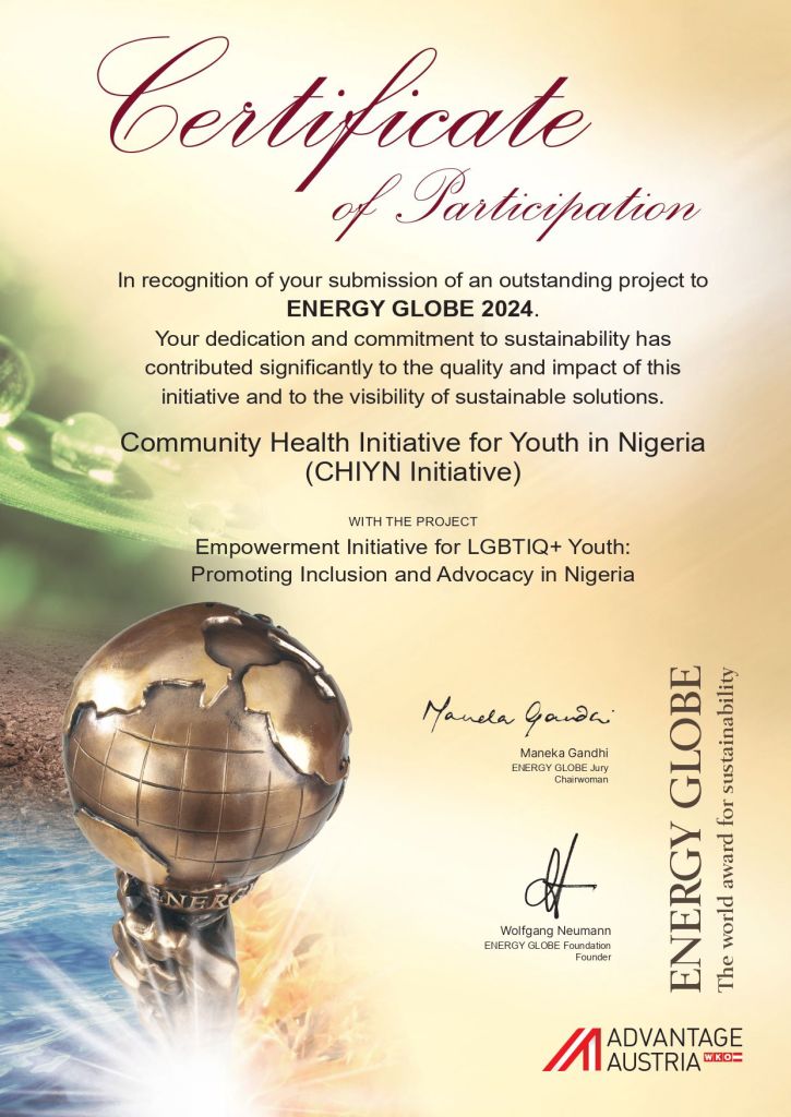 It is with immense pride and gratitude that I share the exciting news that Community Health Initiative for Youth in Nigeria (CHIYN Initiative) has been recognized with a Certificate of Participation by the Energy Globe Award 2024 for our outstanding project: